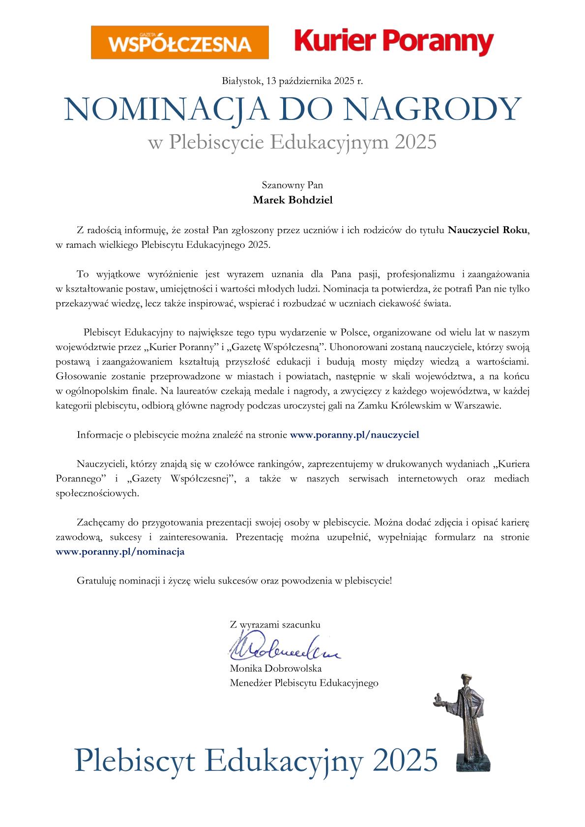 W tegorocznej edycji Plebiscytu Edukacyjnego 2025 („Kuriera Porannego” i „Gazety Współczesnej”), do nagrody został zgłoszony Pan Marek Bohdziel. Gratulujemy!!